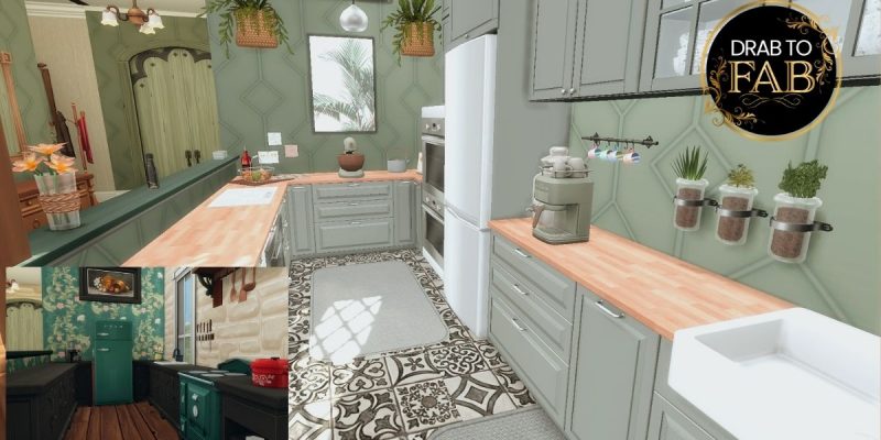 The wall coverings and floors in this Sims 4 kitchen CC design add the perfect finishing touches, grounding the entire space with texture and charm. The soft sage green walls feature elegant raised panel detailing, creating a timeless and sophisticated backdrop that complements both modern appliances and rustic decor. Hanging plants and floating shelves add vertical interest, making the walls feel lively and warm rather than bare. Underfoot, the patterned tile flooring introduces bold character with its vintage-inspired motifs, balanced by a neutral rug that softens the look and creates a cozy work zone by the sink. Together, the walls and floors create a harmonious blend of classic and contemporary styles, tying the kitchen’s design beautifully.