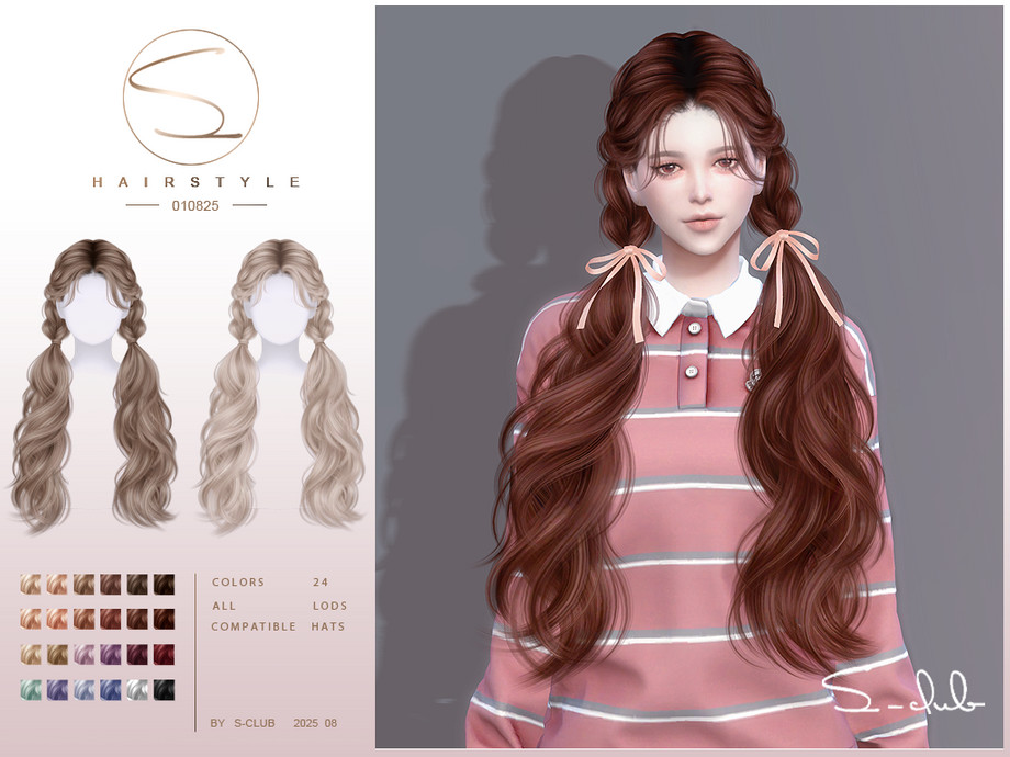 Two braids tied into curly ponytails, Sims 4 alpha hairstyle download.