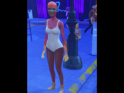 I absolutely love this look. The shrug over the tank top has a really 90’s feel while the cargo skirt with the flames is super cool (Real talk–I have a cargo skirt IRL and it is EXCELLENT). The sneakers are hidden from this picture but they’re based on the real life Ozweego sneakers, adding some label-based flair to the outfit.