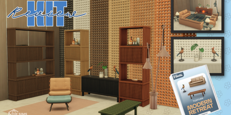 The Modern Retreat Kit comes with twenty-five items. These items are designed to pair well with the outdoor activities as a comfortable connection to relax on a retreat. There are a lot of natural elements in the textures and swatch colors for many of the items. The wood on the bookshelves and latticework is very detailed, and the other elements of this kit also pair well with this. It is a mix between modern luxury and nature indoors when including the clean, sleek, but natural style and the nature-themed art deco pieces.