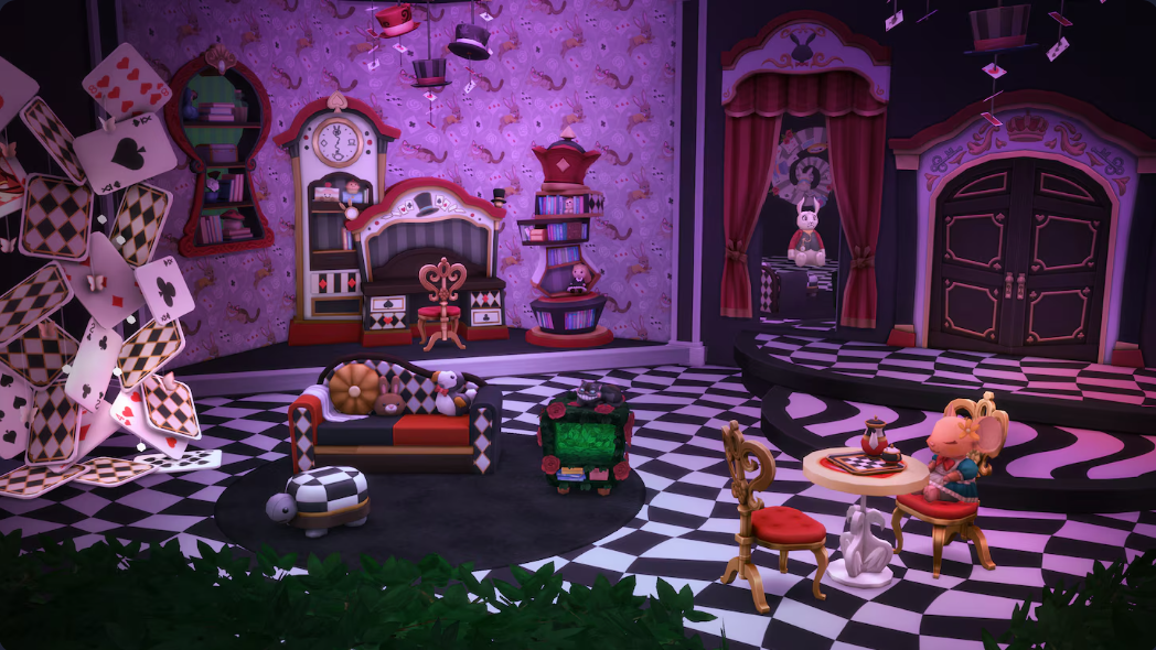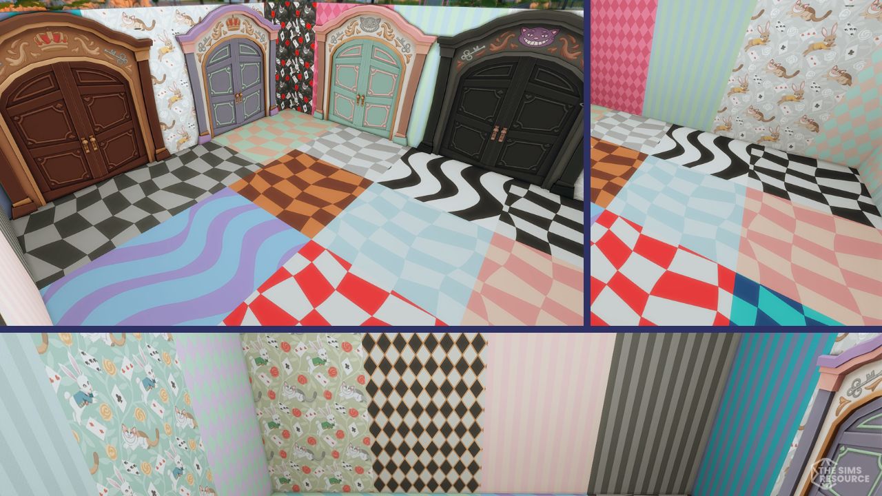 For me, this is where the Kit loses its whimsical vibe and takes on more of a fever dream aesthetic. I have to admit, I’m not a fan of the floors or most of the wallpaper. The combination of bright colors and patterns honestly gives me a headache. However, if the elements are paired separately or with a solid wooden floor, they can work quite well. It’s all subjective; what I dislike, someone else might really enjoy. On a positive note, I do like the doors, the rabbit with cards, and the striped patterns.