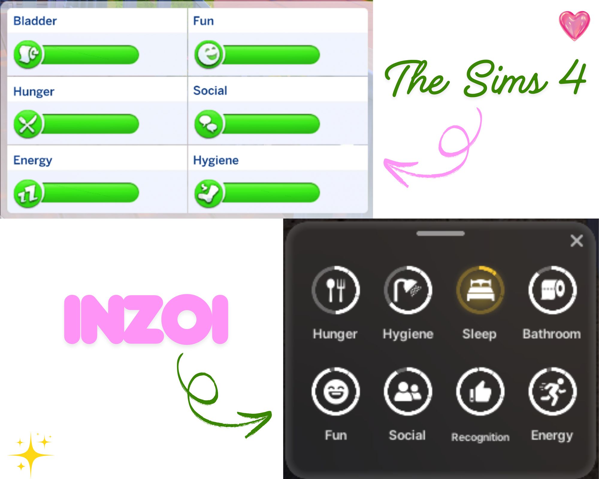 Both InZoi and The Sims 4 feature a system of needs, wants, whims, and aspirations. ZOIs and Sims require these elements to sustain their lives and achieve happiness. When their needs and goals are not met, their emotional well-being begins to decline.