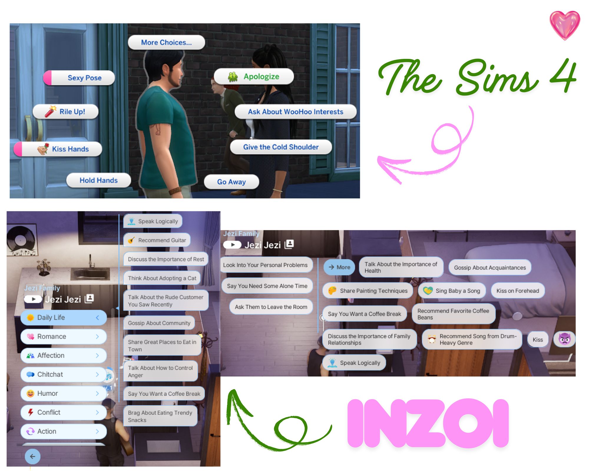 While it includes emotional states and complex life simulation mechanics, the behaviors and interactions of Sims often lean toward the quirky and exaggerated, rather than the subtle and lifelike dynamics seen in InZOI. As a result, InZoi offers a more realistic, cinematic simulation, whereas The Sims 4 focuses on imaginative storytelling and user-driven fun.